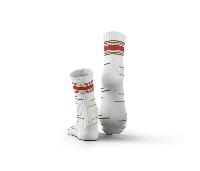 جوارب سترايبس المكسيكي تأتي بخلفية بيضاء أنيقة تتوزع عليها خطوط باللون الأحمر والأخضر والأصفر،