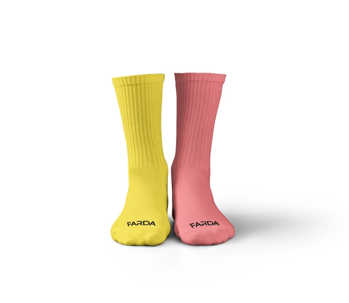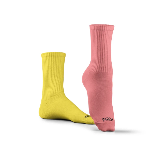 جورب أصفر بوجه ضاحك مفعم بالحيوية، والثاني وردي بشخصية مرِحة خجولة،